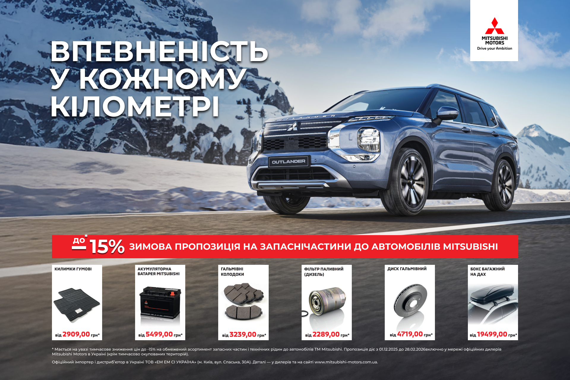 З 01 грудня 2025 року до 28 лютого 2026 року включно в офіційній дилерській мережі Mitsubishi Motors в Україні діє сервісна кампанія  (надалі - Акція). Запрошуємо власників автомобілів Mitsubishi скористатись спеціальною пропозицією на придбання запасних частин та аксесуарів від виробника з вигодою до 15%*.